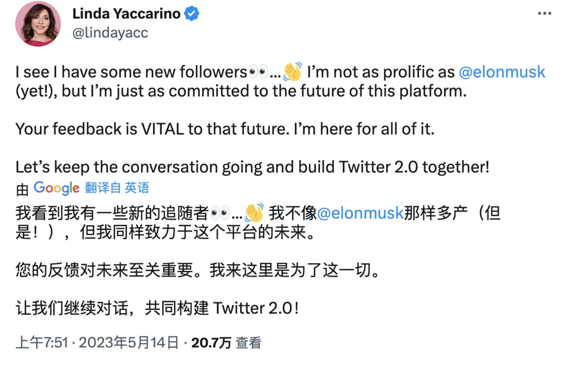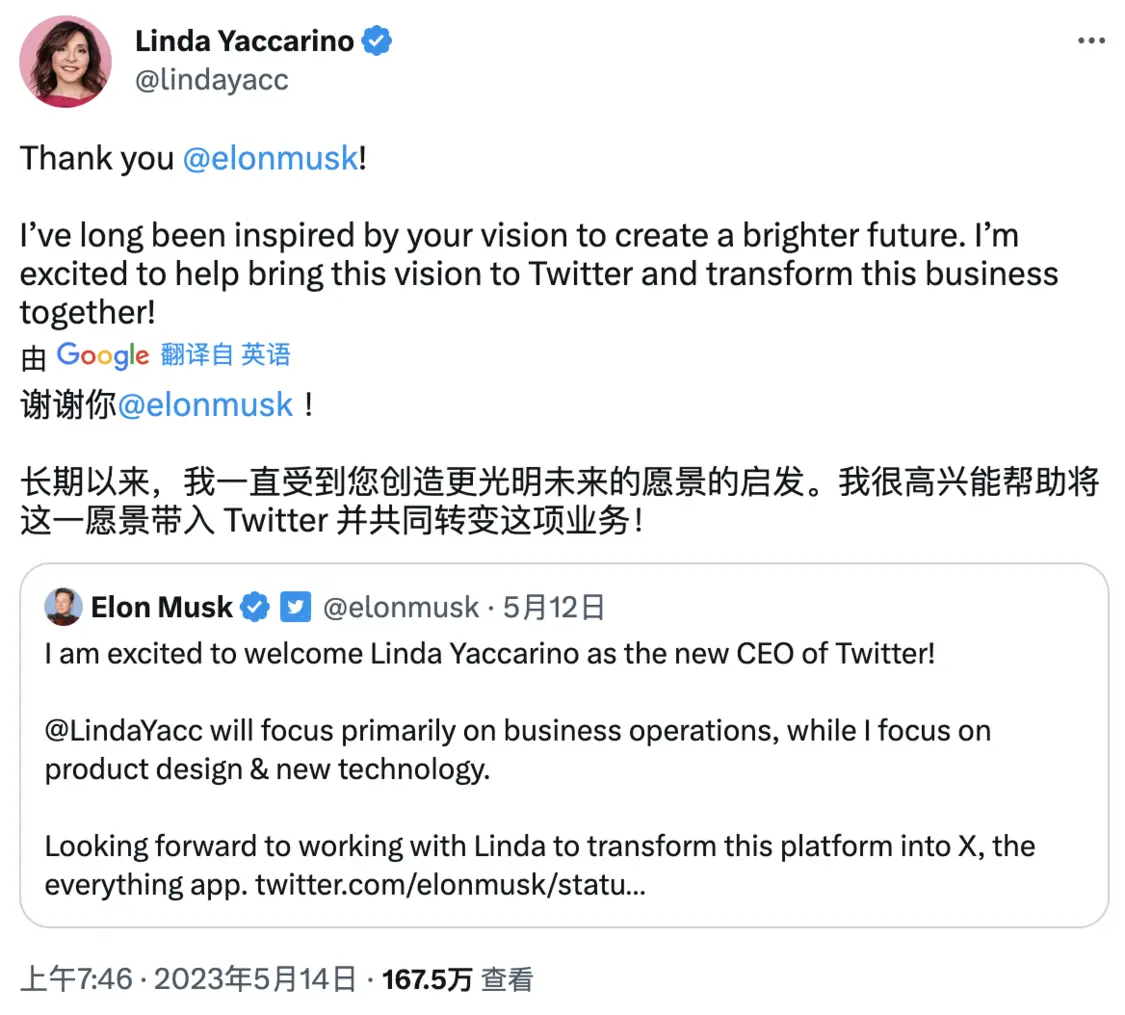 北京时间5月14日消息,Twitter新任CEO琳达·亚卡里诺(Linda Yaccarino)周六在Twitter上表示,她一直受到老板埃隆·马斯克(Elon Musk)关于创造更光明未来愿景的启发,很高兴能帮助改变这个社交媒体平台。