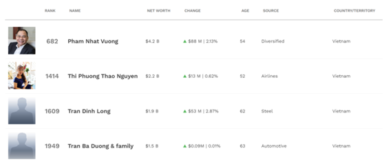 根据福布斯数据,Vingroup创始人(Pham Nhat Vuong)最新身家为42亿美元,现年54岁,全球排名第682位。2021年其身家最高曾达73亿美元。此前,Pham Nhat Vuong实益拥有VinFast上市前76.9%的股份,包括 Vingroup持有的12.42亿股普通股、VIG持有的8.07亿股普通股、Asian Star Trading & Investments Pte.持有的3.62亿股普通股。