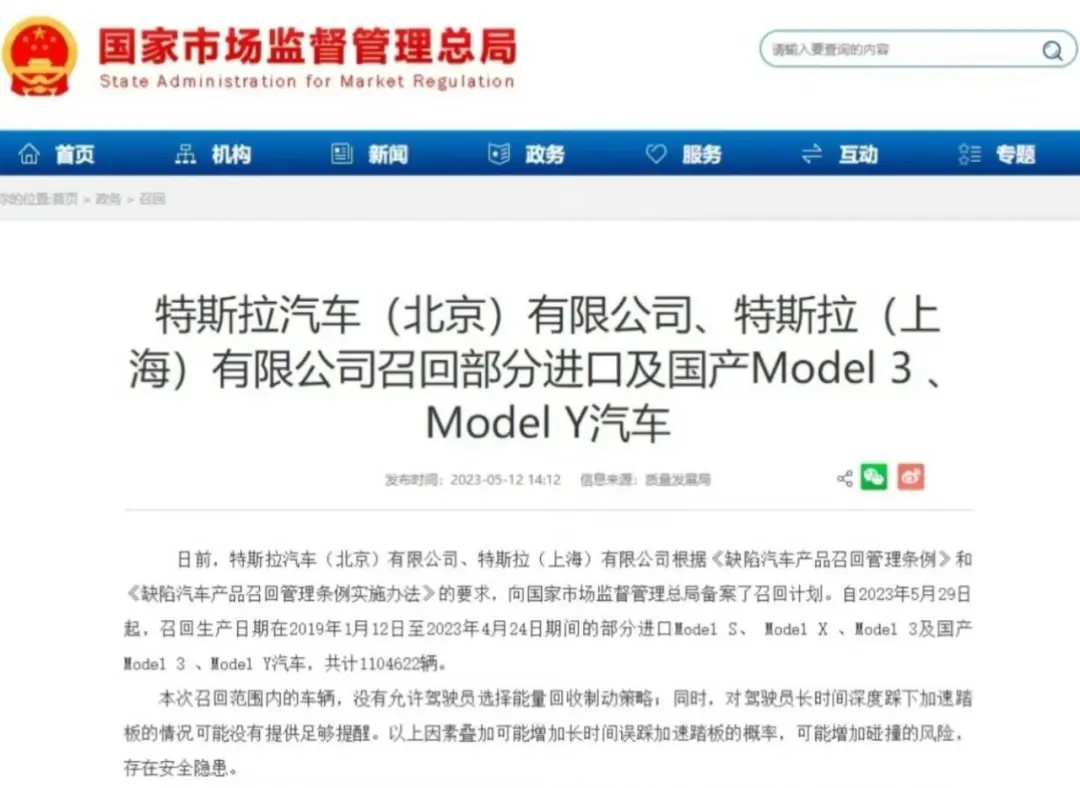 5月12日,根据国家市场监督管理总局消息,特斯拉发起了大规模召回计划。特斯拉汽车(北京)有限公司、特斯拉(上海)有限公司召回部分进口及国产Model 3 、Model Y汽车,共计1104622辆,几乎覆盖了这2019年至今销售的全部车辆。