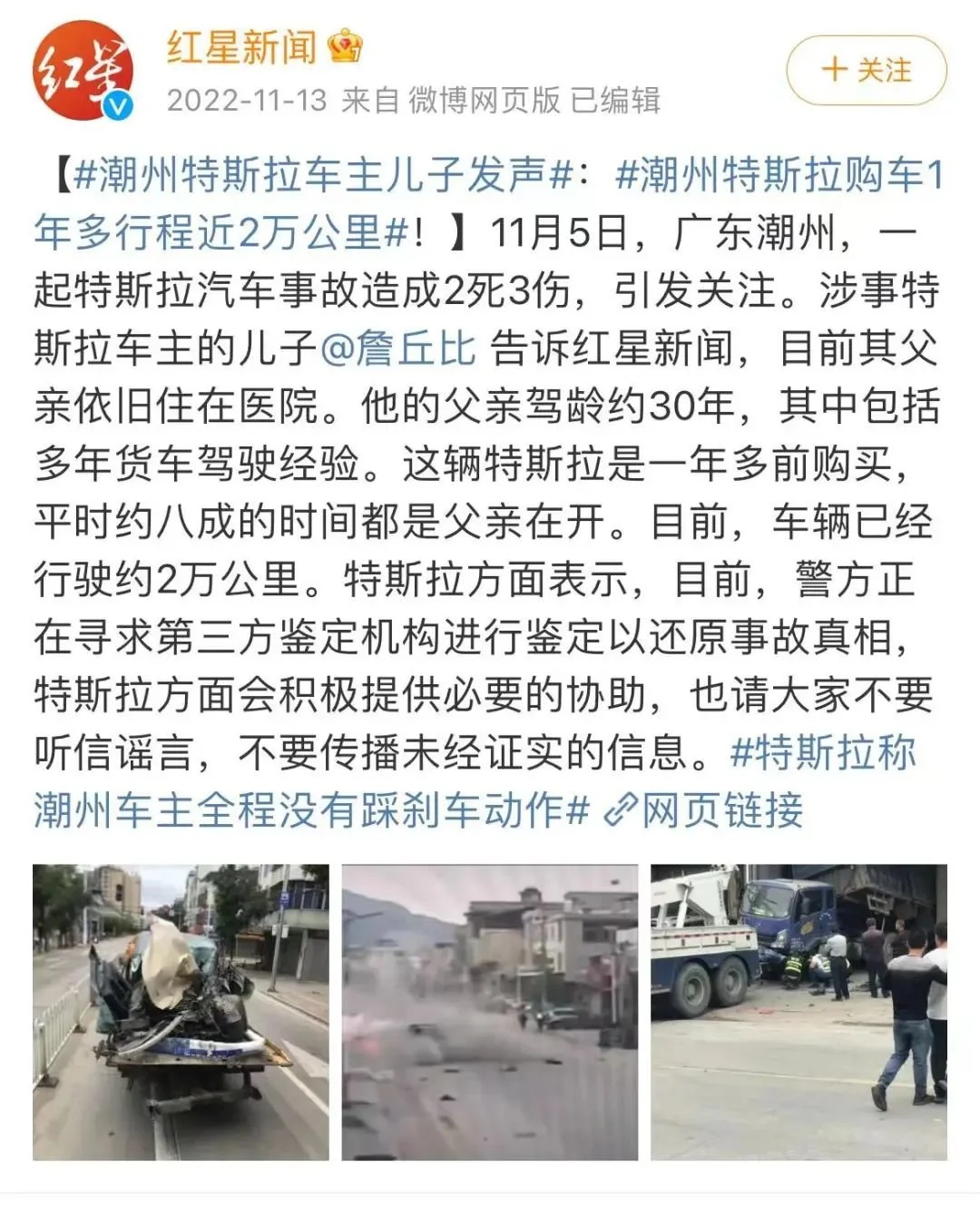 比如最近的一次,2022年11月5日,潮州一辆特斯拉在高速行驶近3公里后在路边撞停,造成2死3伤。