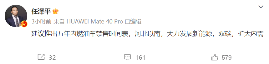 汽车逐步转向新能源,燃油车禁售,已经成为全球共识。只不过,对于何时禁售燃油车这一话题,各国和地区还没有形成统一意见。5月15日,知名经济学家任泽平发文称:“建议推出五年内燃油车禁售时间表,河北以南,大力发展新能源,双碳,扩大内需”。