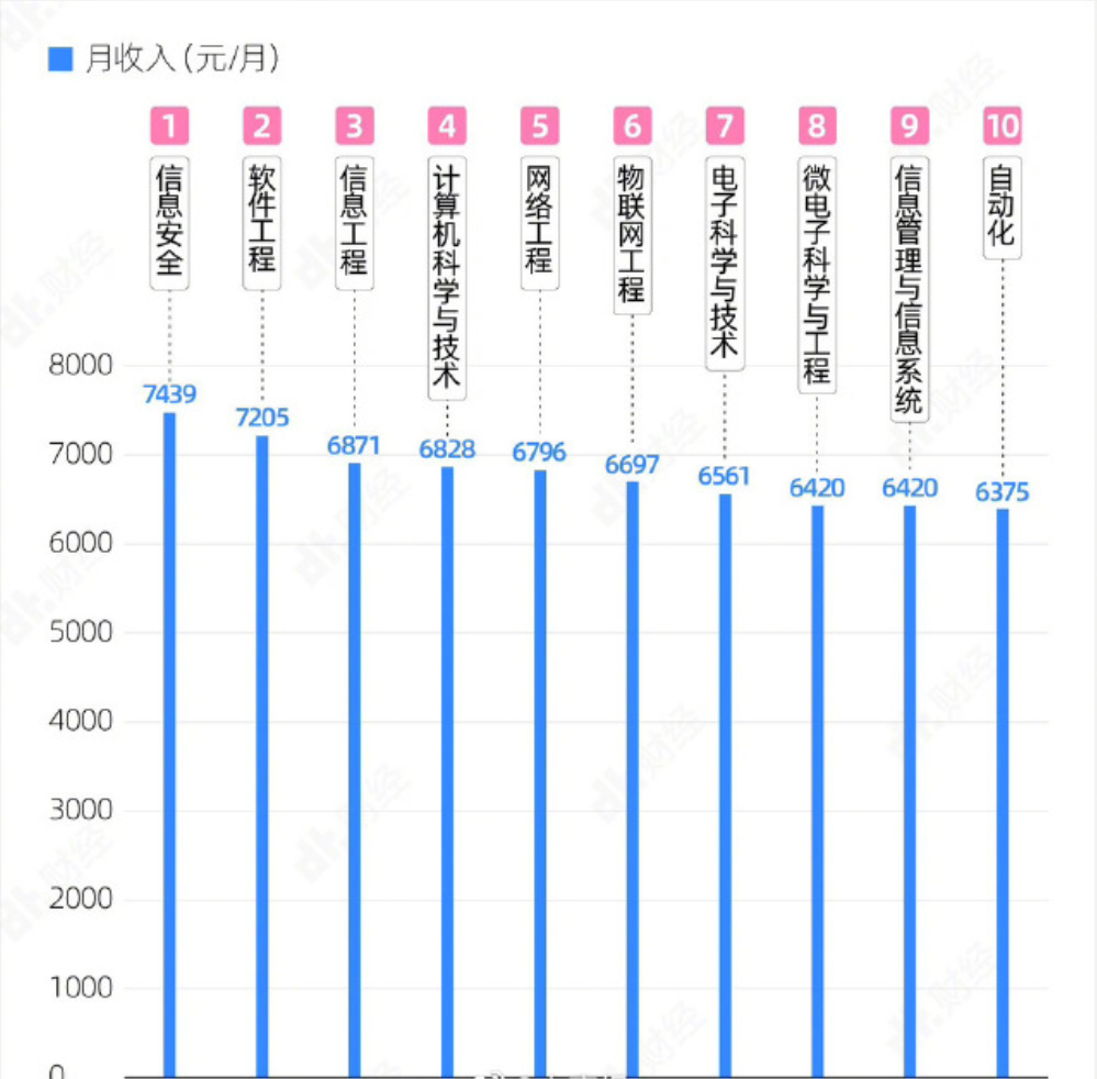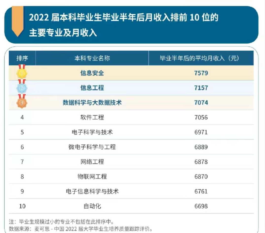 《就业蓝皮书》中显示,2022届本科毕业生10大高薪专业,几乎都被与IT紧密相关的计算机类、电子信息类专业占领。 据2023年就业蓝皮书显示,2022届本科毕业生月收入最高的本科专业是信息安全(7579元),其后是信息工程(7157元)、数据科学与大数据技术(7074元)、软件工程(7056元),应届毕业生起薪均超7000元。