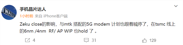 但项目关闭后,与mtk搭配的5G modem计划也跟着喊停了,在台积电线上的6nm /4nm RF/ AP WIP(在制品)也搁置了 。
