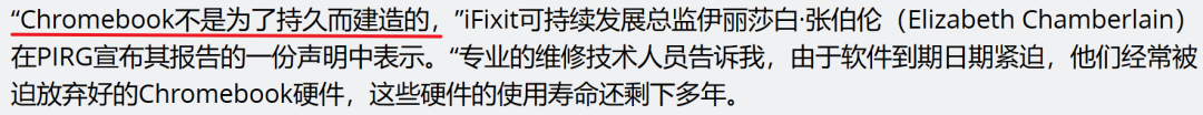 知名拆解和维修网站 iFixit 在一份报告里甚至直说了,Chromebook 就不是为了持久使用而造的,就算硬件寿命还有好几年,紧迫的 AUE 日期也会让用户抛弃掉电脑。