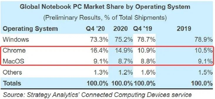 前几年袭来的新冠疫情,更让 Chromebook 迎来了自己的高光时刻,线上教育需求暴涨,Chromebook 和 iPad 一机难求,以及销量超过 MacBook 等等。