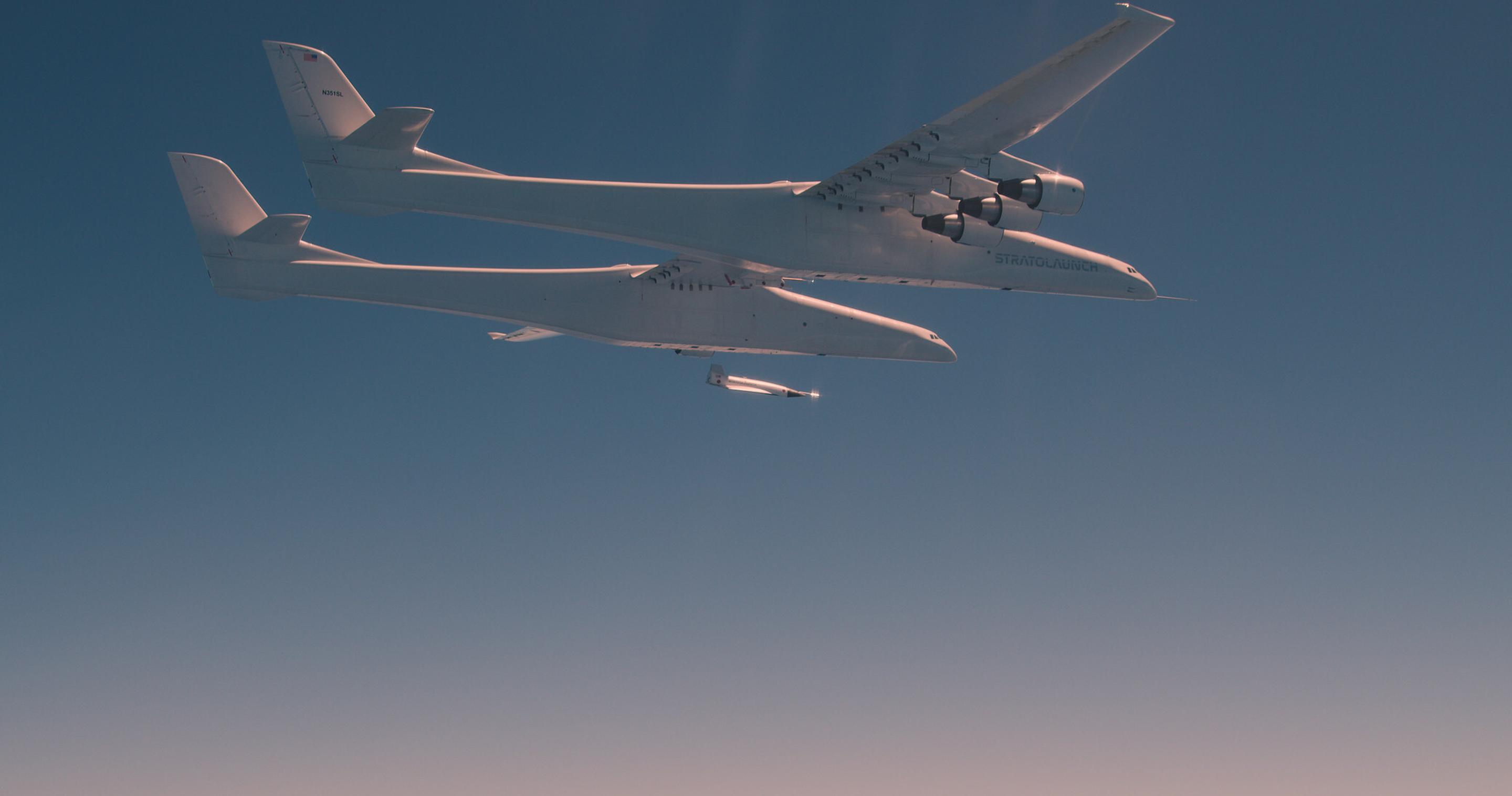 加州航空航天公司Stratolaunch向实现其计划中的高超音速飞行发射系统又迈进了一大步。上周末,该公司成功地将TA-0试验飞行器从其Roc运载飞机上释放。"大鹏鸟"号拥有两个并排的机身,六台用于波音747的发动机,28个轮子,机翼从顶端到末端延伸385英尺(117米),这使得它成为世界上翼展最长的飞机。