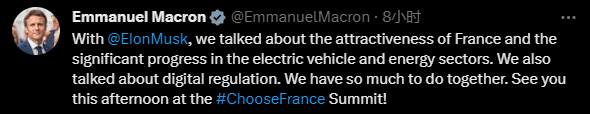 马克龙也在社交媒体上写道,“我们与马斯克谈到了法国的吸引力,以及电动汽车和能源领域的重大进步。我们还谈到了数字监管,有很多事情可以合作。”