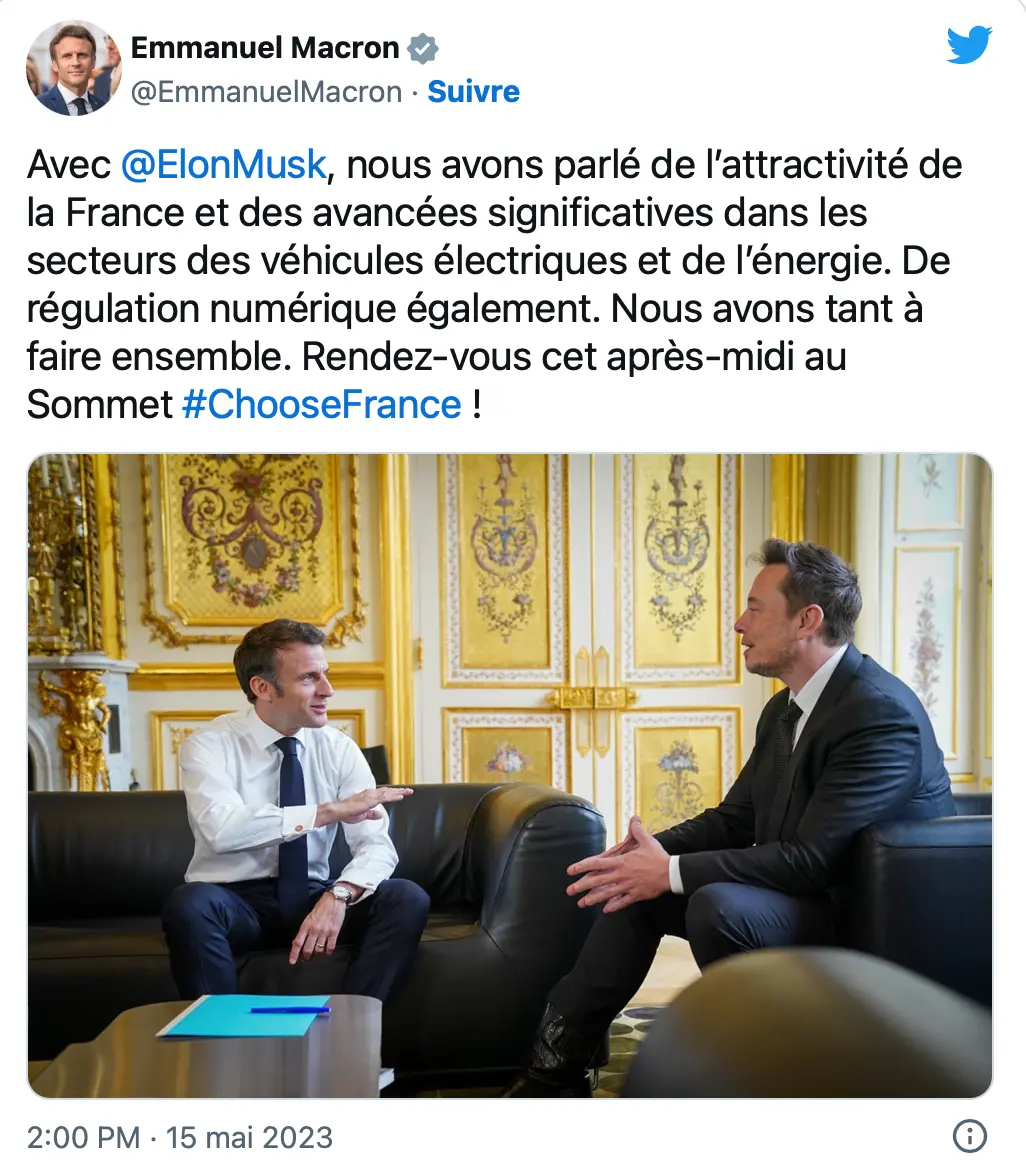 在大约45分钟的会面结束后,当马斯克被媒体问及特斯拉是否有在法国投资的计划时,他给出了肯定的回答。他补充称,计划会在未来的某个时间点宣布,“但不是今天。”