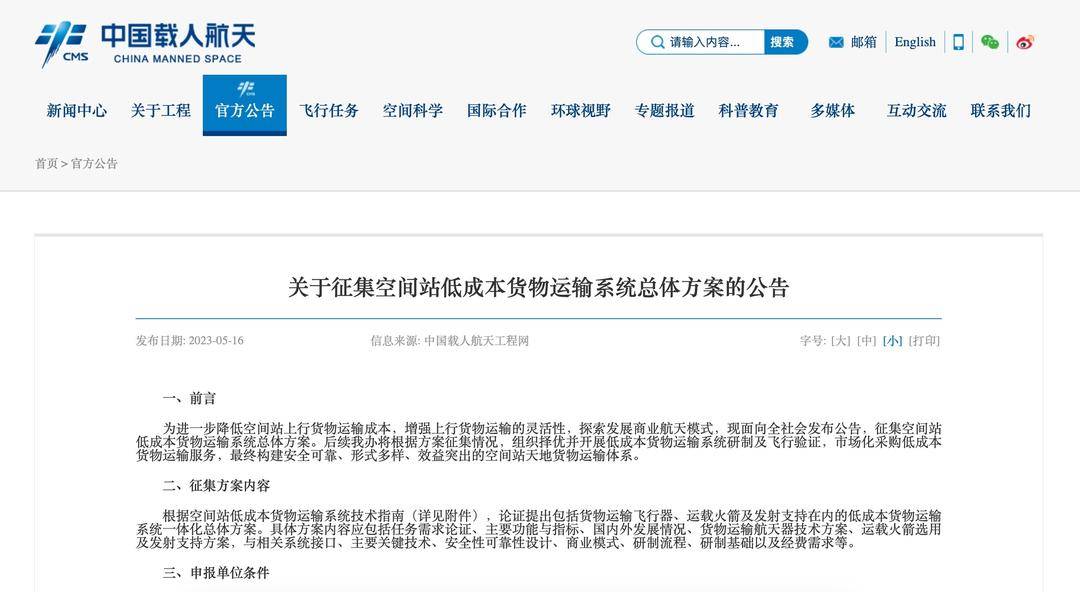 为进一步降低空间站上行货物运输成本,增强上行货物运输的灵活性,探索发展商业航天模式,5月16日,中国载人航天工程办公室发布征集公告,面向社会征集空间站低成本货物运输系统总体方案。