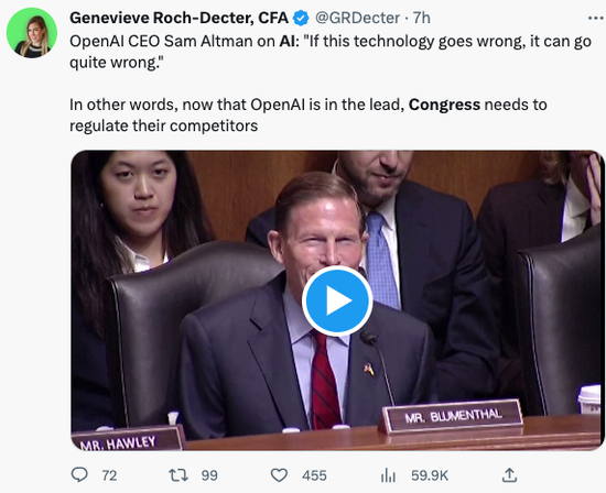 然而,和此前硅谷各巨头因为用户隐私和数据安全问题受到激烈批评不一样,奥特曼这次显然受到了更友好的待遇。议员们基本上没有批评OpenAI的做法,而是非常友善地征求奥特曼和其他证人对ChatGPT等生成人工智能的潜在监管的意见。奥特曼也出乎意料地配合,多次主动要求监管介入,甚至还主动提出了要求政府成立监管机构的想法,让AI领域也开始“凭证入场”。