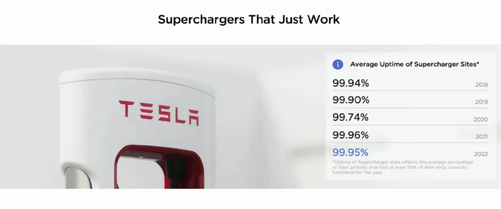 特斯拉的超级充电站也取得了不错的进展,目前超充的正常运行时间已经达到了99.95%。根据美国能源部的数据,特斯拉超充站的数量约占美国所有直流快充站的24%,并且充电功率与使用体验远高于ChargePoint、EVGO等第三方充电运营商。