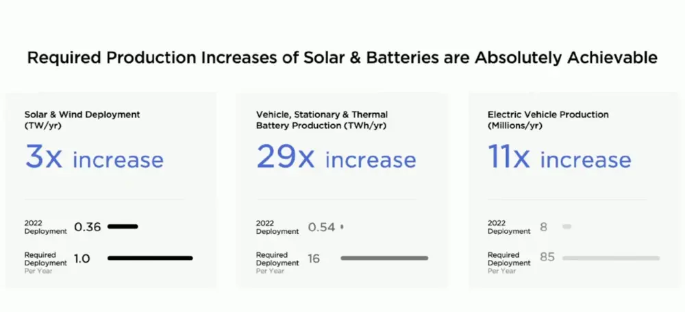 马斯克认为,从根本上决定了全球可持续发展速度的就是电池生产,因此需要让太阳能和风能的年安装量增加3倍、电池年产量增加29倍、电动车年产量增加11倍。