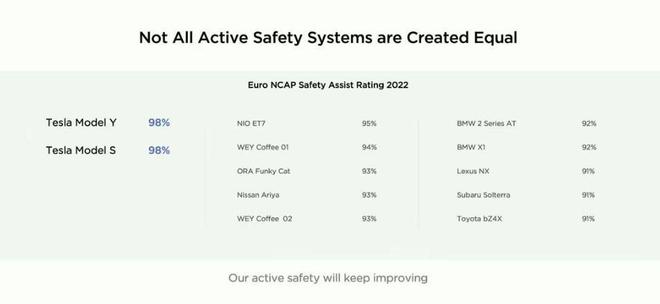 据官方数据显示,Model Y和Model S在欧洲碰撞测试(E-NCAP)中主动安全方面的评分是98%。马斯克强调,“我们肯定还会把失去的2%争取回来”。