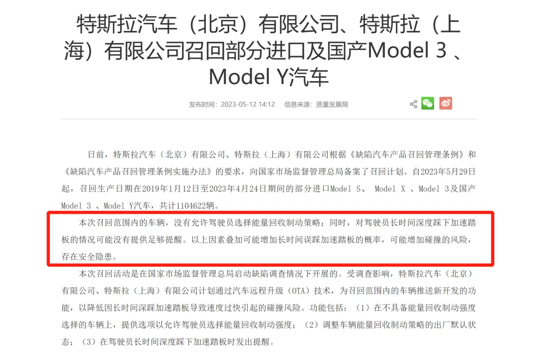 争论已久的单踏板模式,或许就要跟我们告别了。5月13日,国家市场监督管理总局公告显示,特斯拉备案了召回计划,计划召回生产日期在2019年1月12日至2023年4月24日期间的部分进口及国产汽车,总计110.46万辆。