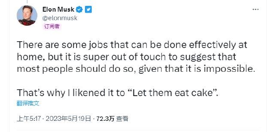 此前几天马斯克在接受采访时表示:“我认为在家工作的整个概念有点像玛丽·安托瓦内特(Marie Antoinette)的假名言‘让他们吃蛋糕吧’,这不仅仅是生产力的问题,我认为这在道德上是错误的。”