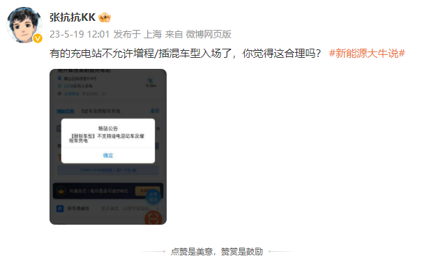 今日,汽车博主“张抗抗KK”分享了自己遇到的最新的一件事,其表示:有的充电站不允许增程/插混车型入场了,你觉得这合理吗?从其分享的手机截图看,是位于深圳市某充电站发布公告称,不支持油电混动及增程车充电。