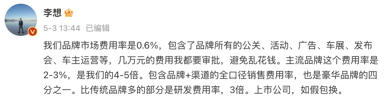 事实上,确实就是没有人会在营销上不花钱——理想也是,只是比较少,据李想在微博中提供的数字,理想的品牌市场费用率虽然只有0.6%,不过一年也有6亿元-7亿元左右,但低至几万元的费用都需要李想本人亲自审批。