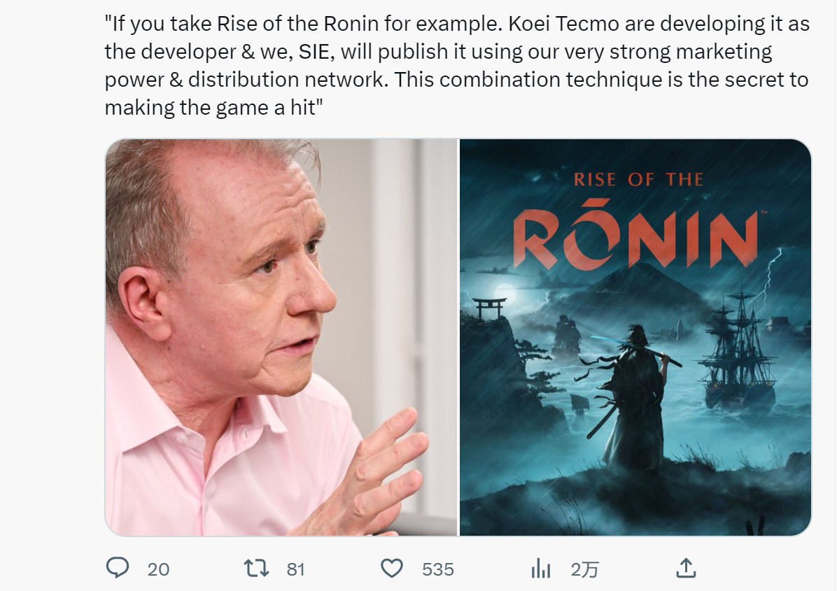 对于《浪人崛起》,Jim Ryan表示:“以《浪人的崛起》为例。光荣将作为开发者进行开发,而我们SIE将利用我们强大的营销力量和分销网络进行发行。这种组合技巧是让游戏大受欢迎的秘诀。”