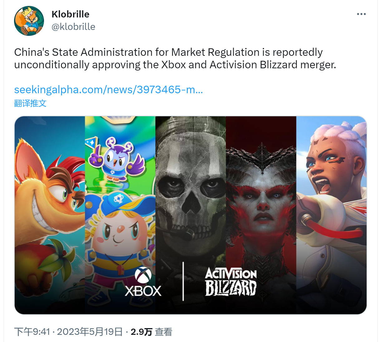 据外媒seekingalpha报道,微软690亿美元收购动视暴雪的提议已经获得中国反垄断机构的批准。据Dealreporter援引知情人士的话报道,中国国家市场监督管理总局在第三轮调查时无条件批准了微软收购提议。