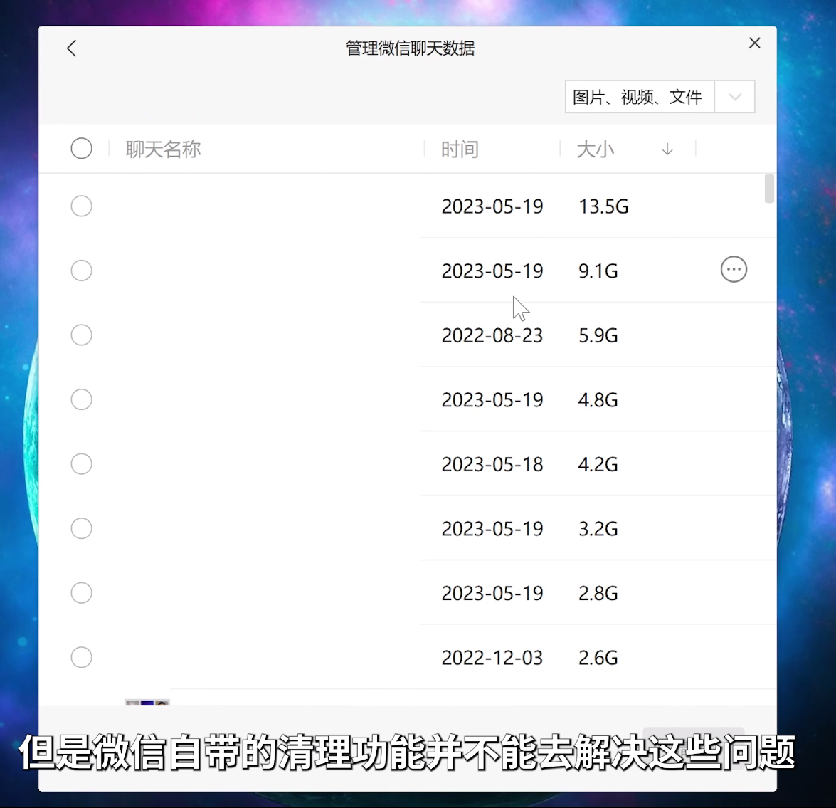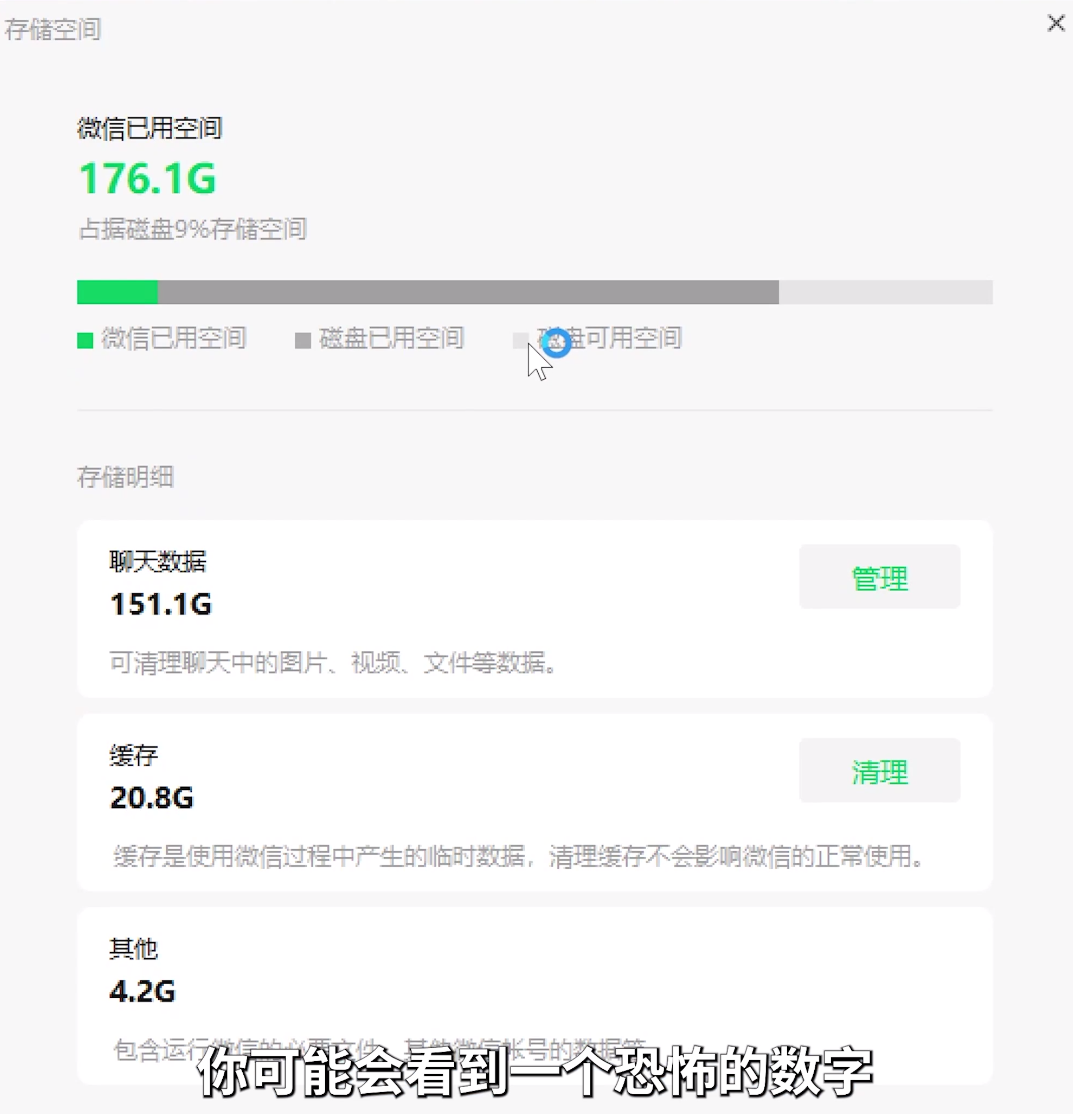 他们用来举例的电脑版微信中,磁盘空间占用高达176GB,其中151GB多都是聊天中的图片、视频、文件等,20.8GB是缓存。