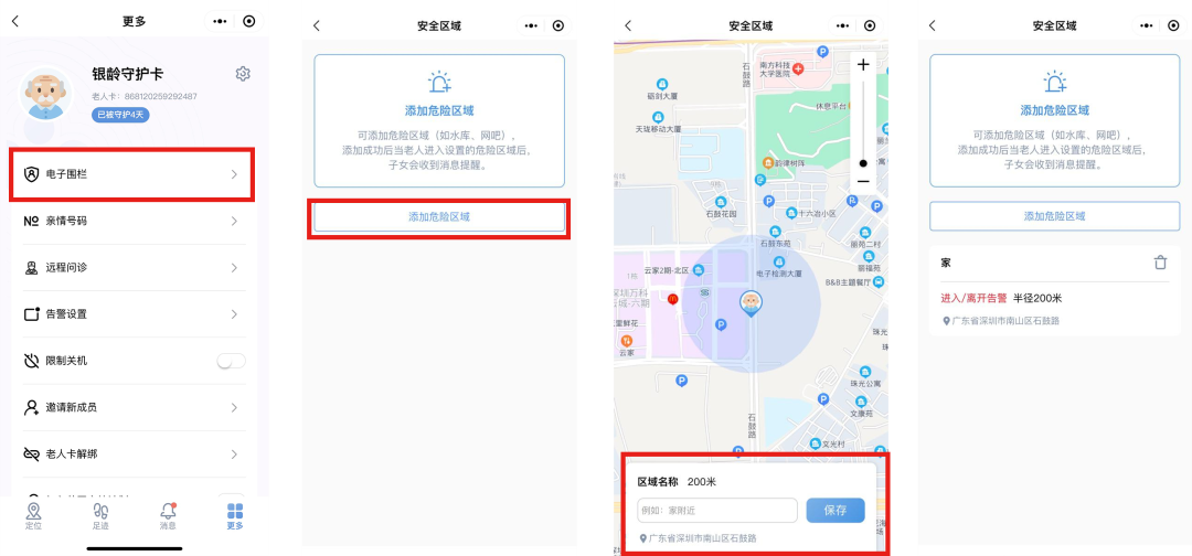 设置安全围栏,老人走进“危险区域”,也会触发SOS呼救。