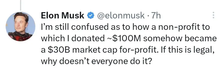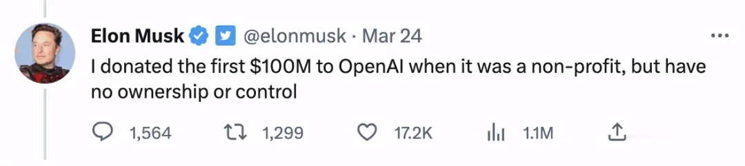而且他还不止一次强调自己“捐赠的1亿美元”:我现在可没有任何OpenAI所有权或控制权!