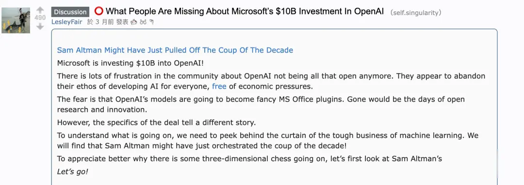 2019年,急需资金的OpenAI重组,成立营利性公司OpenAI LP,先是接受了微软的10亿美元投资。