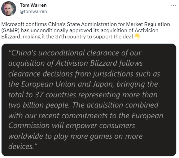 微软表示:“中国已无条件批准我们对动视暴雪的收购,我们对动视暴雪的收购交易现已在37个国家/地区获得批准,包括欧盟27个国家、中国、日本和巴西等,覆盖了全球超过20亿人口的区域。此次收购与我们最近对欧洲委员会的承诺相结合,将使全球消费者能在更多设备上玩更多游戏。”