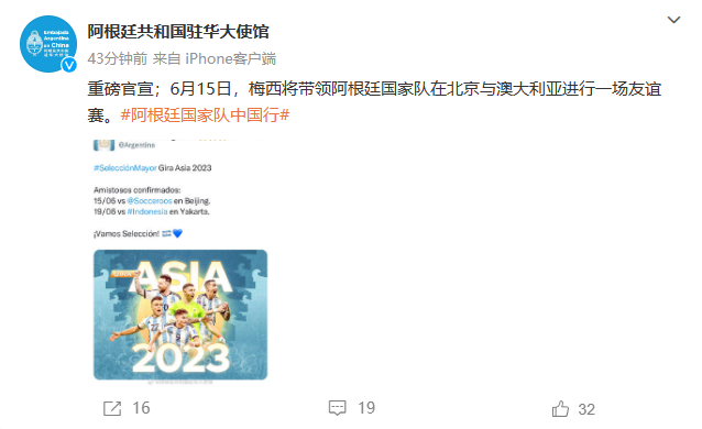 阿根廷驻华大使馆官微正式宣布,6月15日梅西将带领阿根廷国家队在北京与澳大利亚进行一场友谊赛。这也是传了很长时间的小道消息了,如今终于确定。梅西如今在国内人气非常火爆,尤其是在去年带领阿根廷拿下世界杯冠军之后。