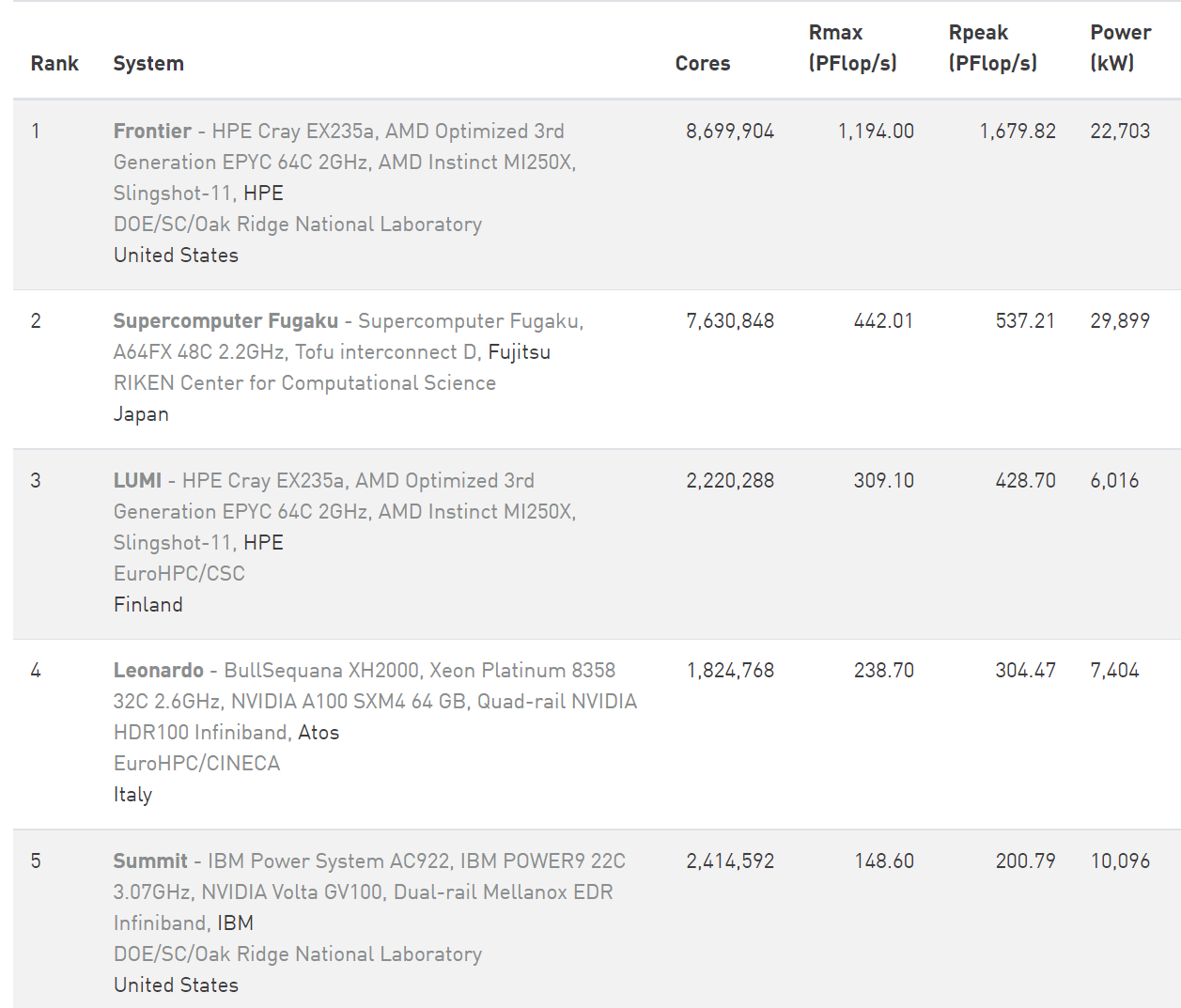 第四名是位于意大利的Leonardo超算,性能相比去年底也有所升级,第五名的是IBM研发的Summit超算,也是之前多次拿到冠军的超算。