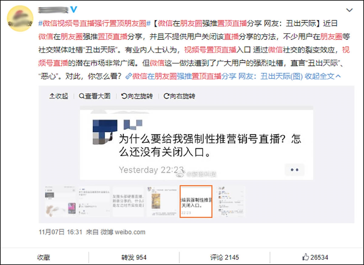 比如2020年11月,微信就曾测试过“朋友圈强行置顶信视频号直播”的功能,当有微信好友分享了通过视频号的直播时,你的朋友圈就会出现一个置顶的直播入口,显示“朋友分享的直播”,看起来非常扎眼。