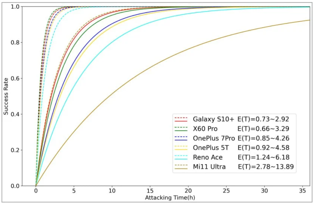 值得一提的是,根据实验数据,当用户在一台设备上录入多个指纹时,暴力破解所需的时间将出现明显下滑,这与多个指纹生成匹配图像的概率更高有关。