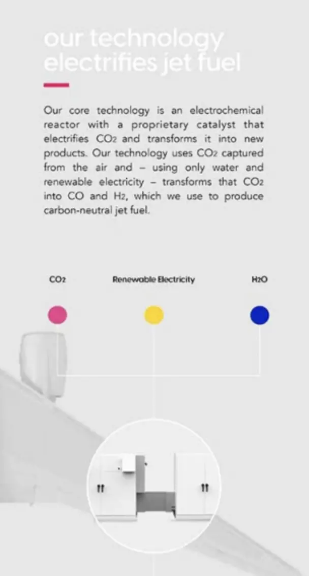 Twelve这家公司因为走了另一条路线获得了许多关注,他们的核心专利技术是叫做E-Jet®的零碳无化石喷气燃料,这一过程只需要二氧化碳、水和电作为原料,就可以通过化学反应器将二氧化碳转换成新产品,航空燃料便是重要应用之一。过去几年内,电力再生、二氧化碳捕捉和电解器等Twelve所需的技术成本都在降低,因此Twelve生产E-Jet®过程的成本也比目前其他SAF生成方式更便宜。