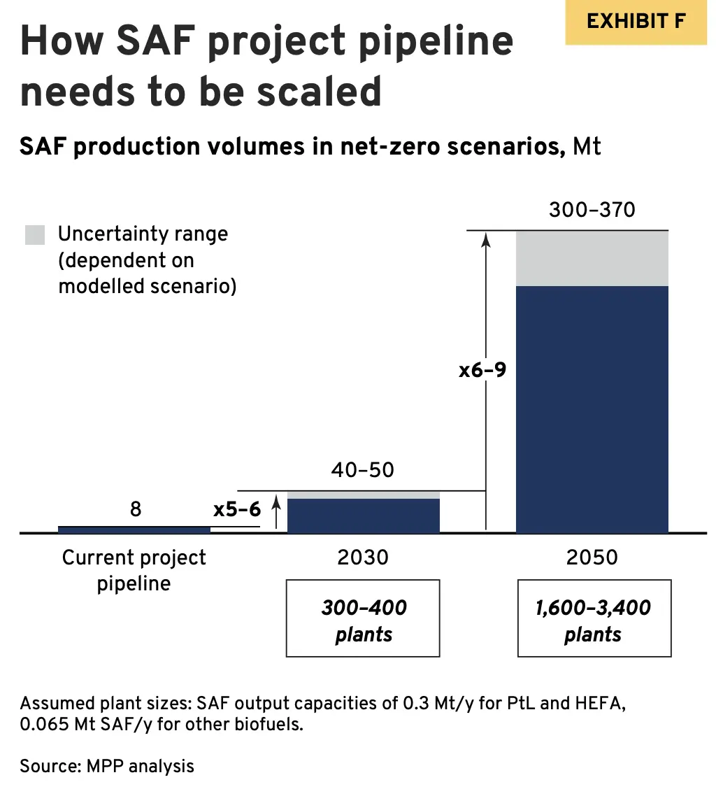 为了满足人类的航空需求,到2030年全球可持续航空燃料行业需要增设300-400个新工厂,建成一个工厂至少需要5年的时间,这就意味着生产效率更需要提升,至少要达到目前的5倍,而在2030年到2050年不管是工厂数量还是生产效率都更需要加倍。