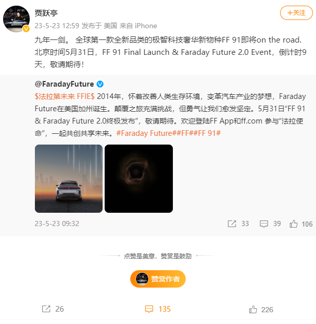 法拉第未来(Faraday Future即“FF”)今日发文预热称,将于5月31日进行“FF 91&Faraday Future 2.0终极发布”。法拉第未来创始人贾跃亭转发这则动态并表示,“九年一剑,全球第一款全新品类的极智科技奢华新物种FF 91即将on the road”。