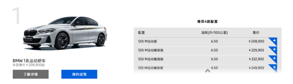 目前,宝马官网显示,1系共有4款车型在售,售价分别为20.89万元、22.99万、23.29万、24.99万元,动力上分别提供1.5T三缸发动机以及2.0T发动机,最大功率分别为136马力和178马力。