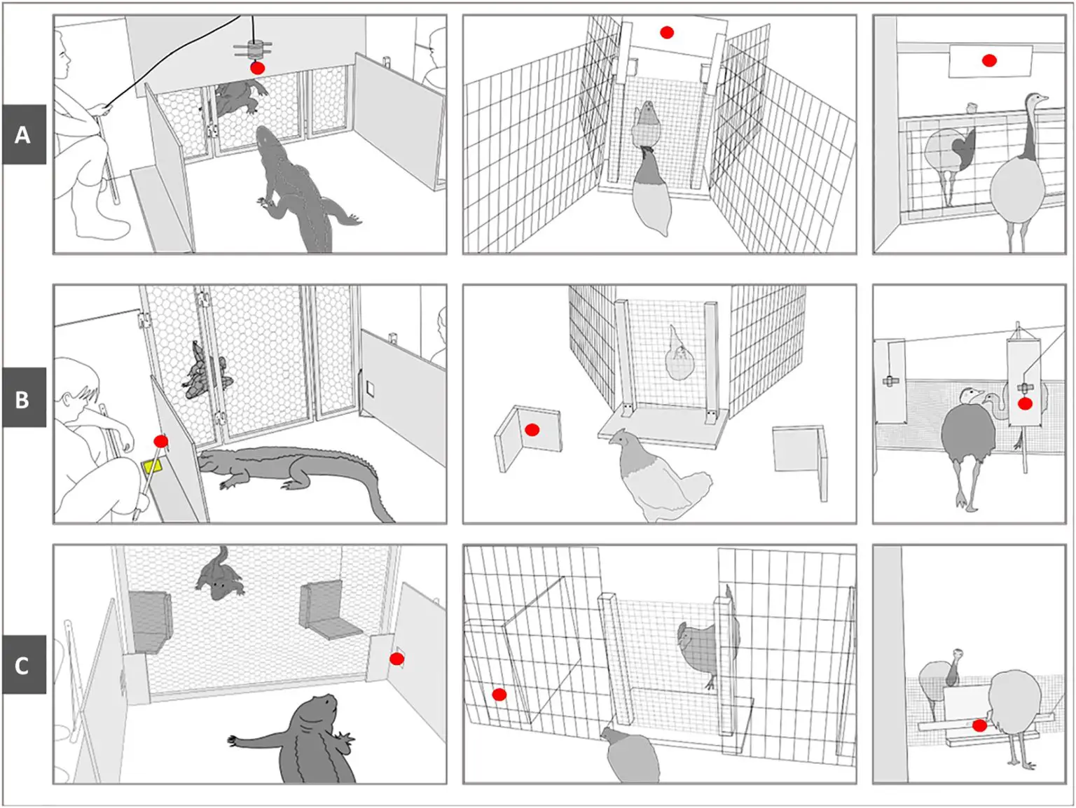 图1. 该研究的实验设置。面板描述了鳄鱼、小型鸟类(红色丛林鸟和雅冠鸟)和大型鸟类(鸸鹋和雉鸡)的实验设置(从左到右)。(A) 实验1的设置(仰视)。(B) 实验2的设置(注视侧面)。(C) 实验3的设置(几何学)。红点描述了用于引诱演示者目光的刺激物(关于刺激物的更多信息,见材料和方法)。资料来源:《科学进展》,DOI:10.1126/sciadv.adf0405