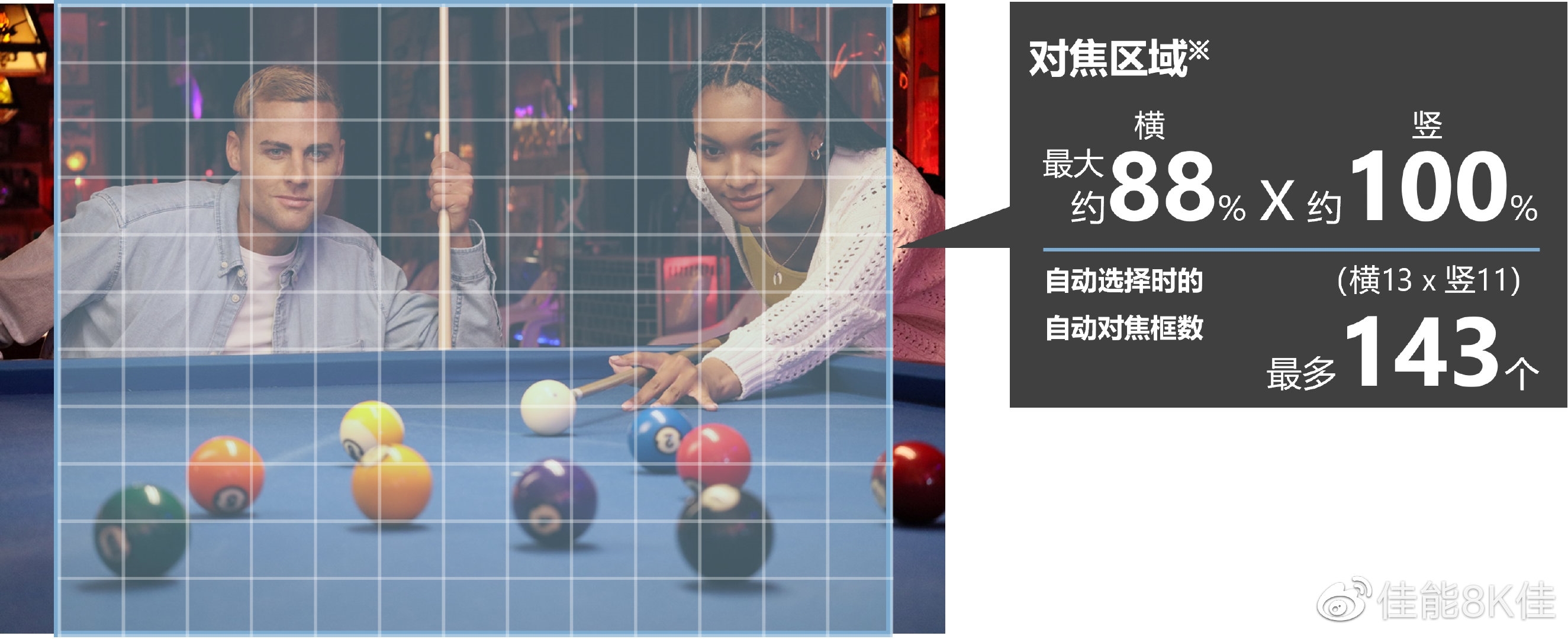 支持全像素双核自动对焦,可实现在较大范围内高速对焦,在88%×100%对焦区域内最多有143个自动对焦框,另外还可以实现伺服自动对焦最高约3.5张/秒的连拍,以及单次自动对焦下最高约6.5张/秒的连拍速度。
