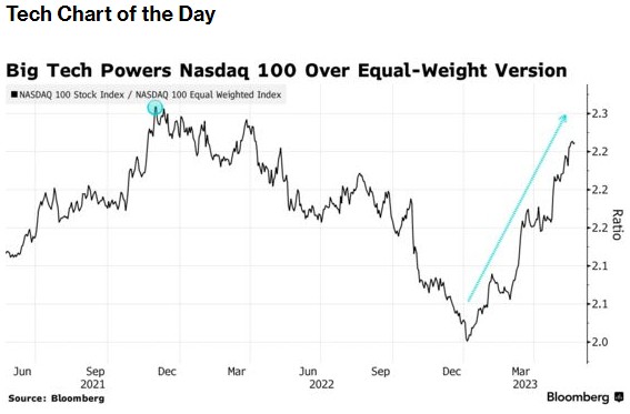 大型科技股今年的表现如此出色,以至于纳斯达克100指数与同等权重指数的比率接近一年多来的最高水平。受苹果、微软、Alphabet.、亚马逊、英伟达、特斯拉和Meta等主要股票强劲上涨的支撑,该指数今年迄今上涨了25%,而同权重指数仅上涨了12%。