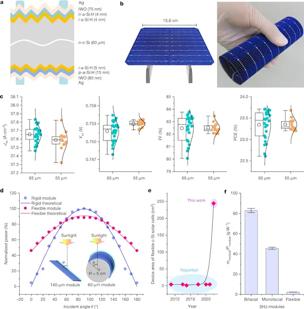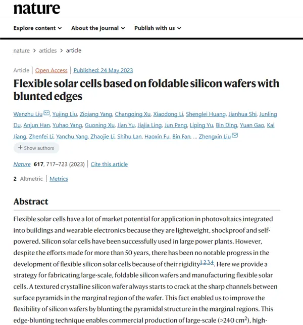 柔性太阳电池在可穿戴电子、移动通讯、车载移动能源、光伏建筑一体化、航空航天等领域具有广泛应用空间。日前,中科院上海微系统所宣布,研究团队成功研制出能像纸一样弯曲,且不易断裂的高柔韧性单晶硅太阳电池,该成果已于5月24日在国际学术期刊《自然》(Nature)发表。