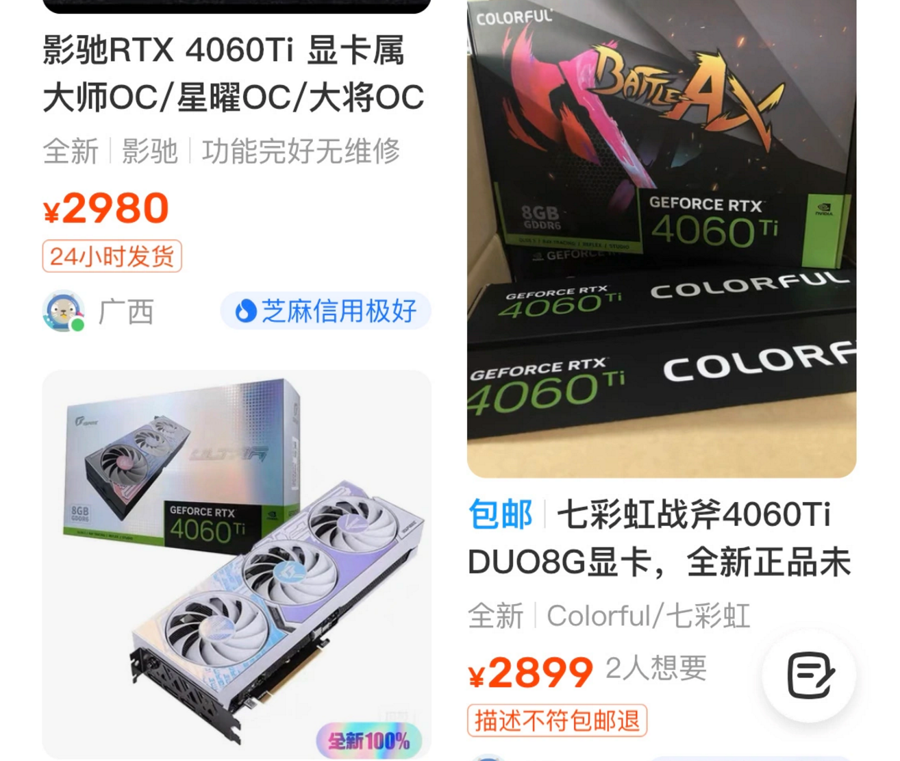 RTX 4060 Ti昨天晚上终于开卖了,不过目前已经破发,你买它还是等RX 7600呢?3199元起RTX 4060 Ti昨晚开卖后,有不少玩家发现,闲鱼平台上它的售价已经跌破首发价,跌破3000元随处可见。