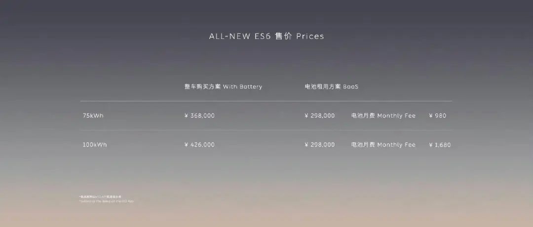 蔚来“全村的希望”——全新ES6价格终于揭晓:36.8万起!新车有两个版本,75kWh版本的是36.8万,100kWh的为42.6万,CLTC续航里程分别为490km和625km。如果采用电池租用方案,全新ES6的裸车价为29.8万。