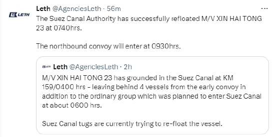 运河服务提供商Leth在推特上表示,今日在苏伊士运河短暂搁浅的散货船重新浮上水面,为这条世界上最重要的水道之一扫清了障碍。Leth称,“新海通23号”于当地时间早上7点40分成功浮上水面。这艘船此前的搁浅导致运河上的一些交通中断,但苏伊士运河管理局表示,双向交通已恢复正常。