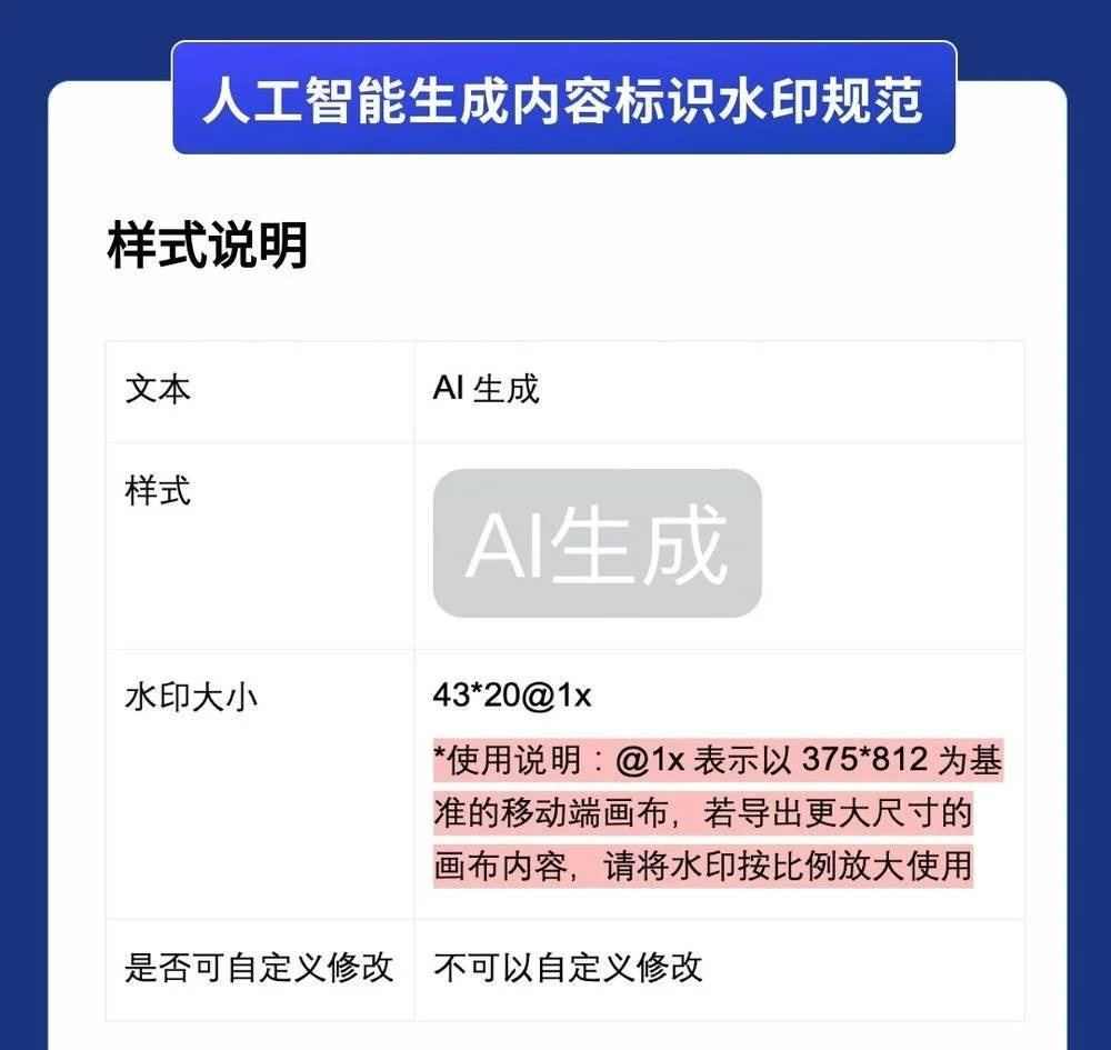 图:抖音规定的“AI生成”水印样式。图片截取自《抖音关于人工智能生成内容标识的水印与元数据规范》