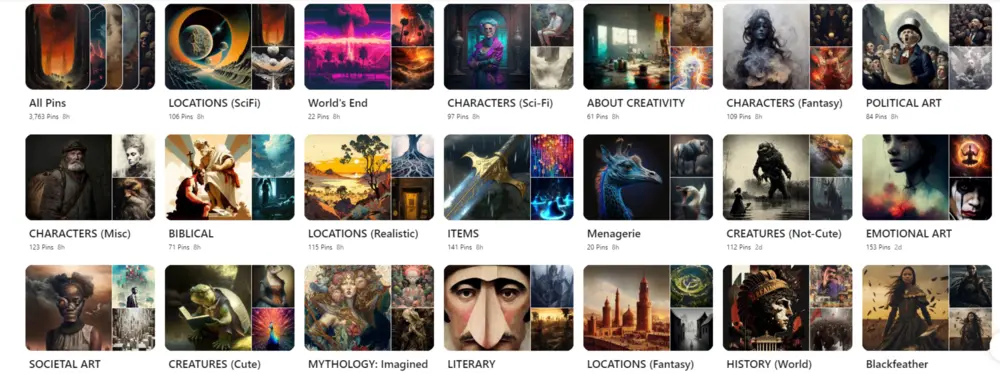 图:Pinterest上一位AI辅助创作者的作品目录。他把自己利用Midjourney生成出来的近百个主题(如“科幻场景”“通灵旅程”“政治画”“圣经风格”等)分门别类,整理成库