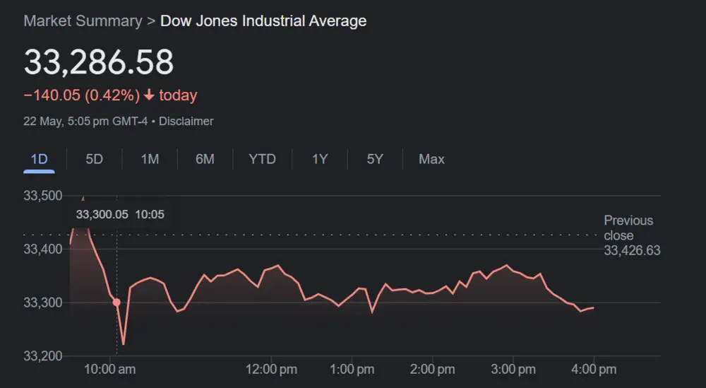 图:当地时间5月22日的美国道琼斯工业平均指数行情。在10点之后发生了小幅下跌