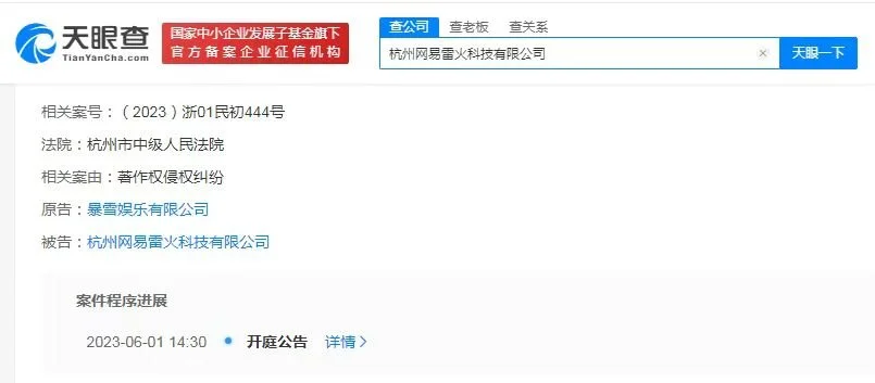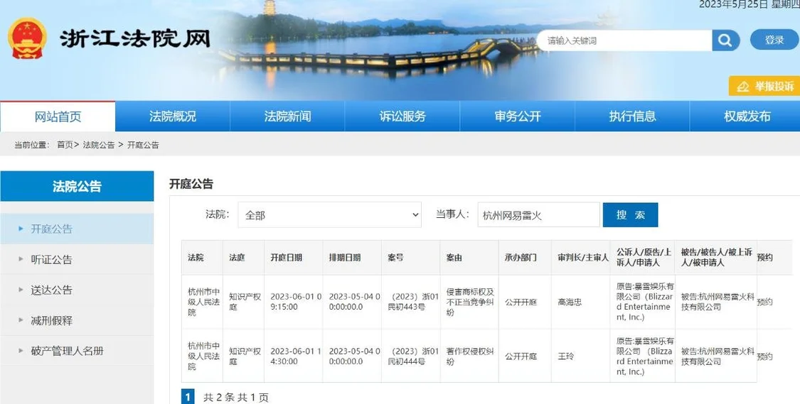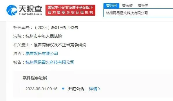 5月25日消息,据天眼查App显示,近日,杭州网易雷火科技有限公司新增两则开庭公告,案由分别为著作权侵权纠纷和侵害商标权及不正当竞争纠纷,原告均为暴雪娱乐有限公司,两案件将于6月1日在杭州市中级人民法院开庭。