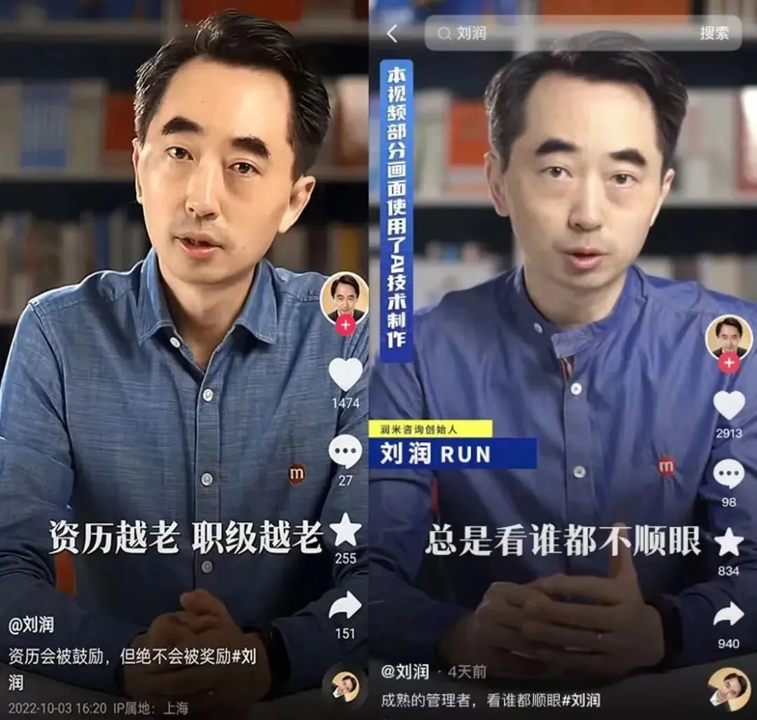 润米咨询创始人刘润、商业分析师张琦都曾让AI分身代替自己出镜拍摄短视频,鲜有观众能分辨出哪个是真人,哪个是数字人。