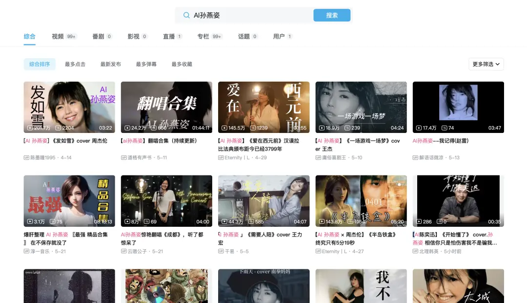 关键“她”还特别卷,每天都有不少“新作”面世。在B站搜索“AI孙燕姿”,相关翻唱视频达上千条,远远超出了孙燕姿本人出道23年的唱片数量总和。