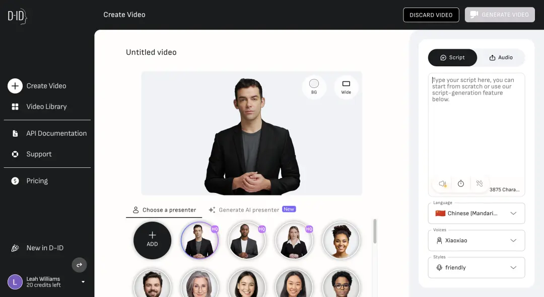 如果想打造一个还原真人外貌、声音的AI分身,一来可以通过免费的数字人制作工具、网站来实现,比较常用的有D-ID、HeyGen等。